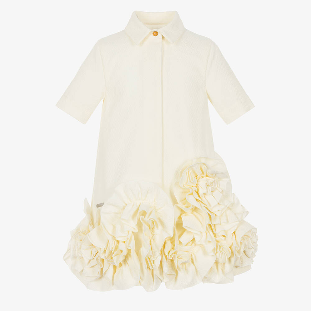 A stylish yellow dress for girls by Jessie and James London, made in a mid-weight cotton blend with a lovely textured pattern. Ideal for a special occasion, this chic shirt dress has a gentle A-line silhouette with dramatic, asymmetric rosette ruffles around the hem. It fastens with concealed buttons on the front and has a comfortable cotton lining.