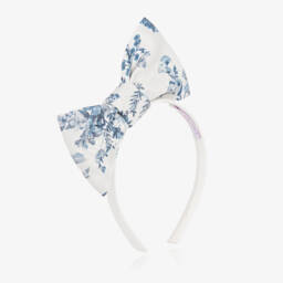 A pretty pink hairband for girls by British brand Jessie and James London. The narrow, flexible band is covered in soft fabric and has an oversized bow on one side woven with glittery pink thread for a sparkly finish.