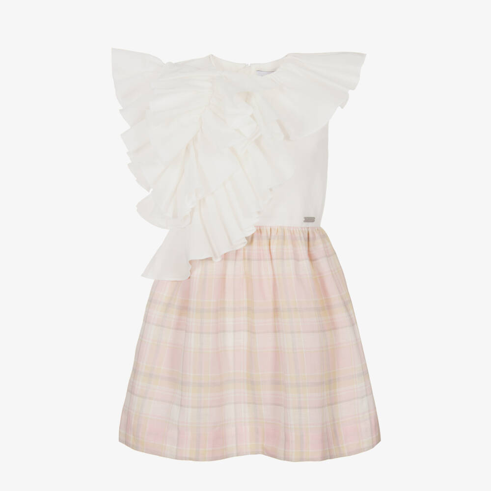 An off-white and pink dress for girls from Jessie and James London. Made in a soft cotton and hemp blend, asymmetric ruffles across the bodice are structured to fall beautifully in a waterfall-effect design. The lightweight linen skirt is woven in delicately pastel shades of pink, green and grey check. The dress is fully lined with breathable cotton voile for comfortable wear. A silver logo plate is stitched on the waist to complete the designer look.