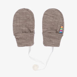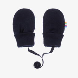 Navy blue mittens for baby boys and girls by Joha, knitted from fine Merino wool jersey. Soft, stretchy, and ribbed, they have a striped logo tab on the side seam.