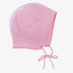 Soft blue Merino wool jersey bonnet for baby boys and girls by Joha. It fastens easily with ties under the chin and has a multi-colour striped logo tab on the side seam, for a subtle splash of colour.