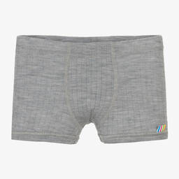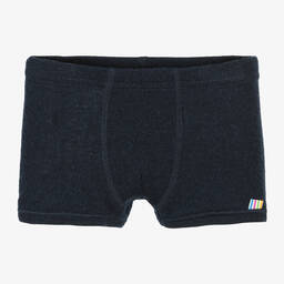 Navy blue thermal boxer shorts for boys by Joha, made from a luxurious, soft and lightweight Merino wool jersey. Comfortable to wear, they have an elasticated waistband and feature a striped rainbow logo tab on the front.