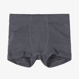 Grey thermal boxer shorts for boys by Joha, made from a luxurious Merino wool and silk blend. These comfortable boxers have an elasticated waistband and a striped rainbow logo tab stitched on the back seam.