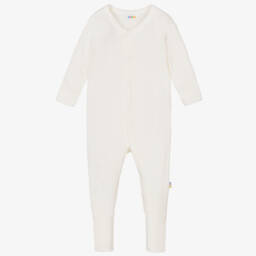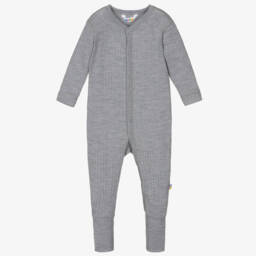 A grey thermal romper for baby boys and girls from Joha, made in super soft and lightweight Merino wool. It has longer length fold-over cuffs on the legs with integrated feet, and fastens with poppers on the front.