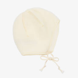 An ivory bonnet for baby boys and girls by Joha, knitted in the softest Merino wool. This thermal hat is lightly padded and covers the ears for added cosiness, tying neatly under the chin.
