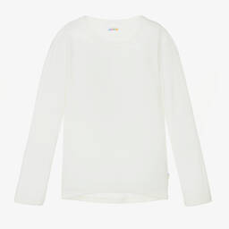 Ivory thermal top for boys and girls by Joha, designed to wear under clothes as an extra warm layer. It is knitted in beautifully soft ribbed Merino wool, and a has a rainbow striped logo tab on the side seam.