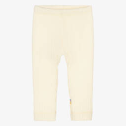 A pair of ivory thermal leggings for little boys and girls by Joha, made in a beautifully soft, ribbed Merino wool. Cosy and warm, they are ideal as an extra layer when the weather turns colder, or they can be worn as comfortable leggings. The waistband is gently elasticated for comfort and there is a striped logo tab stitched on one side seam.
