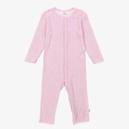 A light blue thermal romper for baby boys and girls from Joha, made in super soft and lightweight Merino wool. It has longer length fold-over cuffs on the legs with integrated feet, and fastens with poppers on the front.