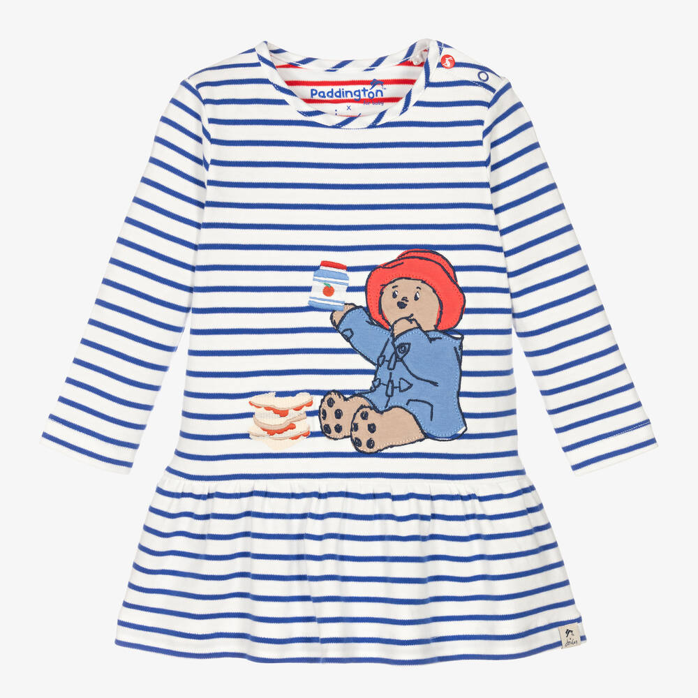 White and bright blue striped dress for baby girls by British label Joules, made in soft cotton jersey. Part of the brand's official Paddington™ collection, it has a cute Paddington appliqué on the front, complete with marmalade and sandwiches! A comfortable, easy-to-wear style, the dress has a dropped waist with a ruffled hem, and popper fastenings on one shoulder.