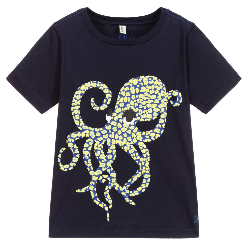 Boys navy blue cotton jersey T-shirt by Joules. Super soft and comfortable, it has a fun yellow and blue foam puff print octopus on the front. There is a navy blue logo patch stitched to the side seam.