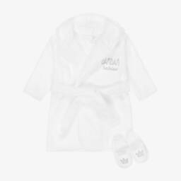 Girls light blue and white spotty dressing gown by Joules, with a cute cat character embroidered on the hood. Made in super soft and fluffy fleece, it has sweet, heart shaped pockets and a detachable tie belt.