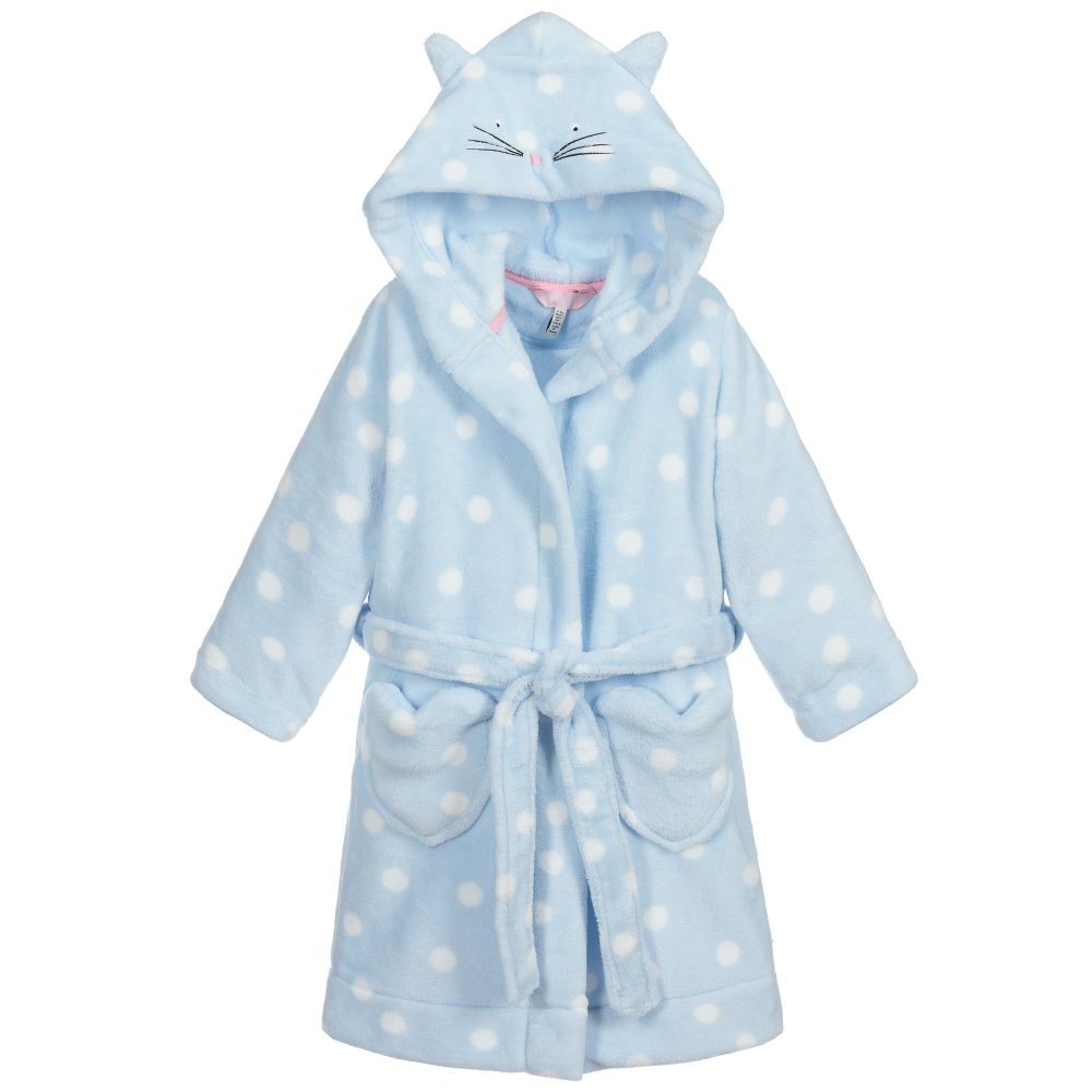 Girls light blue and white spotty dressing gown by Joules, with a cute cat character embroidered on the hood. Made in super soft and fluffy fleece, it has sweet, heart shaped pockets and a detachable tie belt.