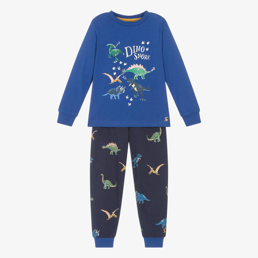 Blue pyjamas for boys by Joules, made in soft cotton jersey. The long-sleeved top has a fun 'Dino Snore' motif printed on the front and a sweet bedtime poem printed on the inside of the neck. The coordinating pyjama bottoms have a stretchy, elasticated waist, completing the bedtime set with comfort.