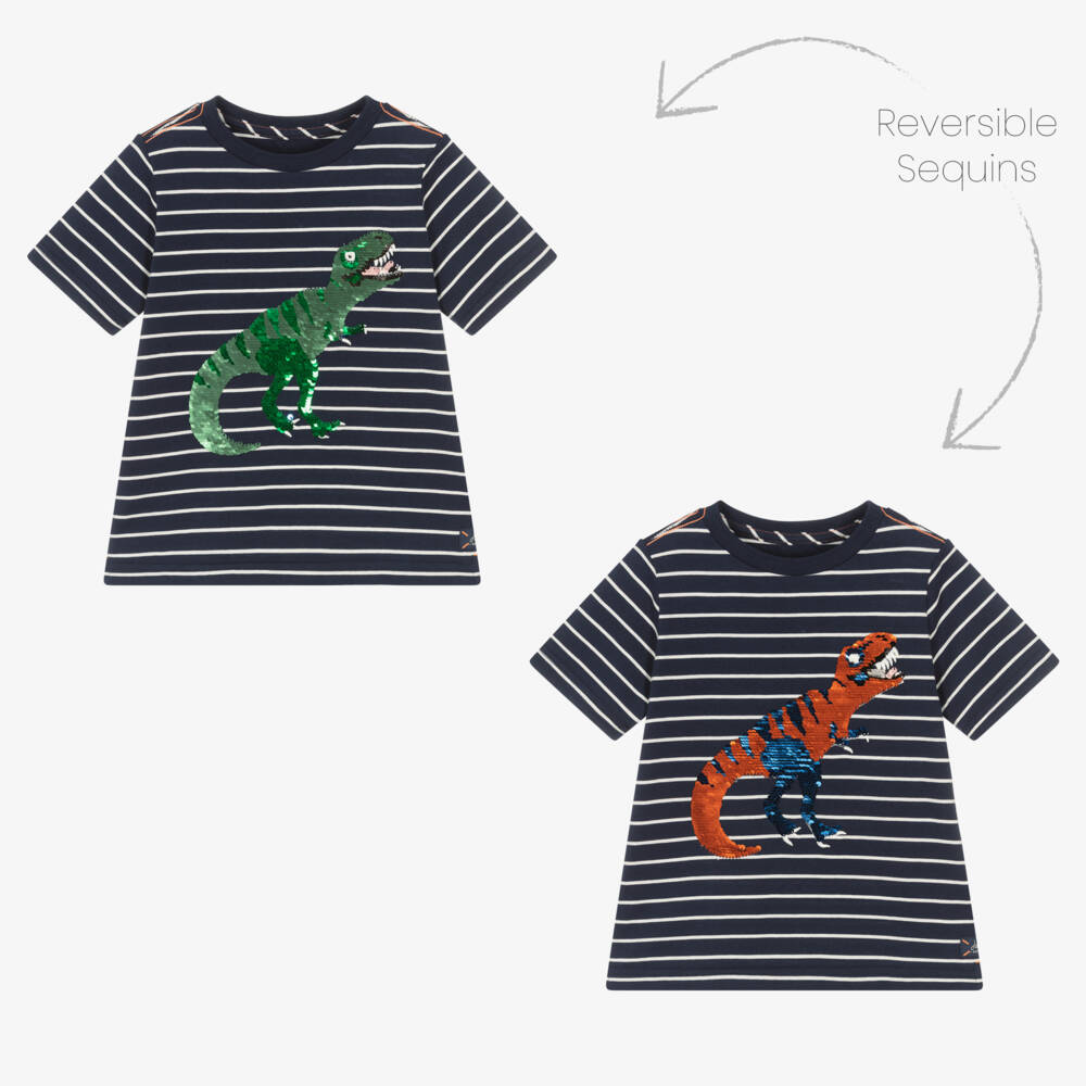 Navy blue cotton T-shirt for boys by Joules. This cool tee has white stripes and a fun dinosaur on the front made up of reversible sequins for two alternative looks. Made in soft jersey with a classic crew neck, it is comfortable and easy-to-wear.