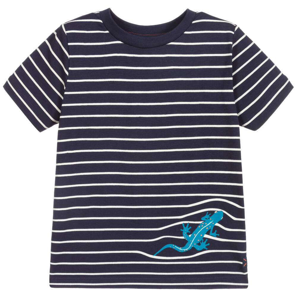 Navy blue striped T-shirt for boys by Joules. It is made in soft cotton jersey, with white stripes and a teal blue newt design on the front.