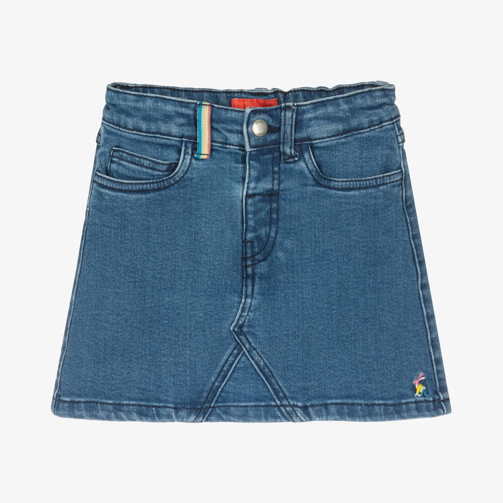 Blue denim skirt for girls by Joules, made in mid-weight cotton with a little stretch. In a traditional five pocket style, it has an adjustable waist and fastens with a single popper for ease when dressing. It has a multi-coloured hare logo embroidered on the front, a matching rainbow on the back, and a colourful belt loop detail for playful finishes.