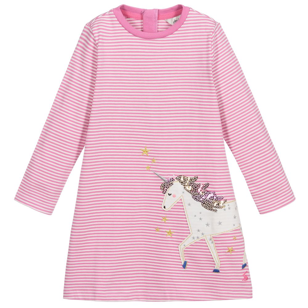 Pink and white striped dress for girls by Joules, made in mid-weight cotton jersey. It has a white appliqué unicorn on the front with gold and silver embroidered stars and sequin trims. The brand's iconic hare logo is embroidered in pink at the hem.