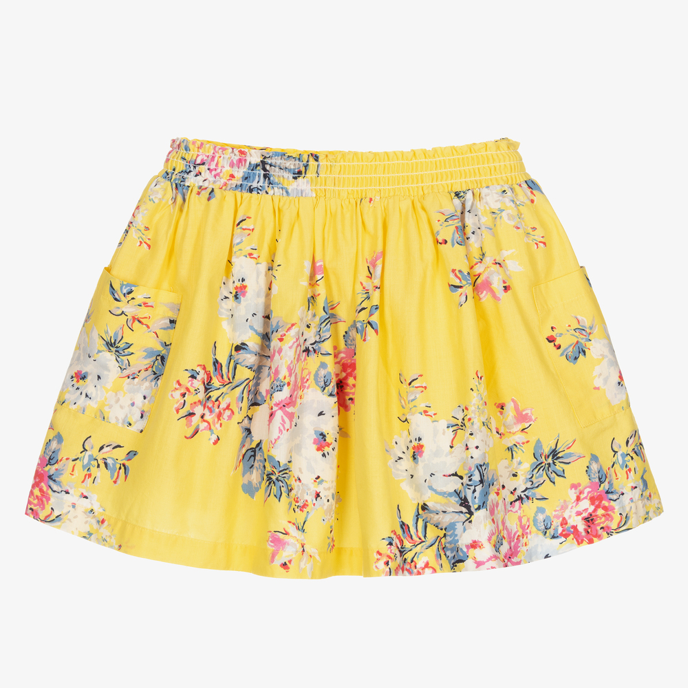 Bright yellow skirt for girls by British brand Joules, made in soft, lightweight cotton. It has a blue and pink floral pattern and patch pockets on the sides. Fully lined, it has an elasticated waist for comfort and the brand's iconic hare logo embroidered in blue at the hem.