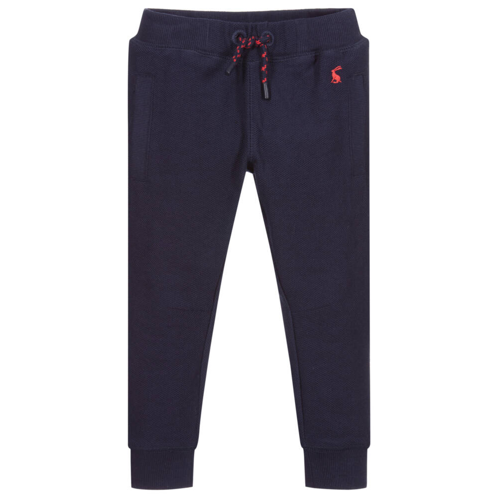 Boys navy blue cotton piqué joggers by Joules. Soft, mid-weight and stretchy, they have an adjustable drawstring waist, side pockets, one back pocket and ribbed ankle cuffs.