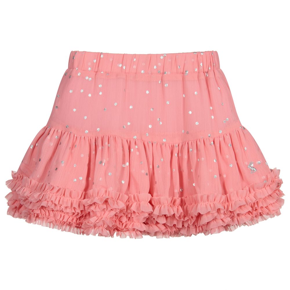 Pretty for girls, a coral pink chiffon tutu skirt by British designer Joules, with a sparkly silver spots design. Lightweight, this fun skirt has a cool polycotton lining and frill trims. The waistband is lightly elasticated for comfort and the brand's signature hare logo is embroidered in silver on the hem.
