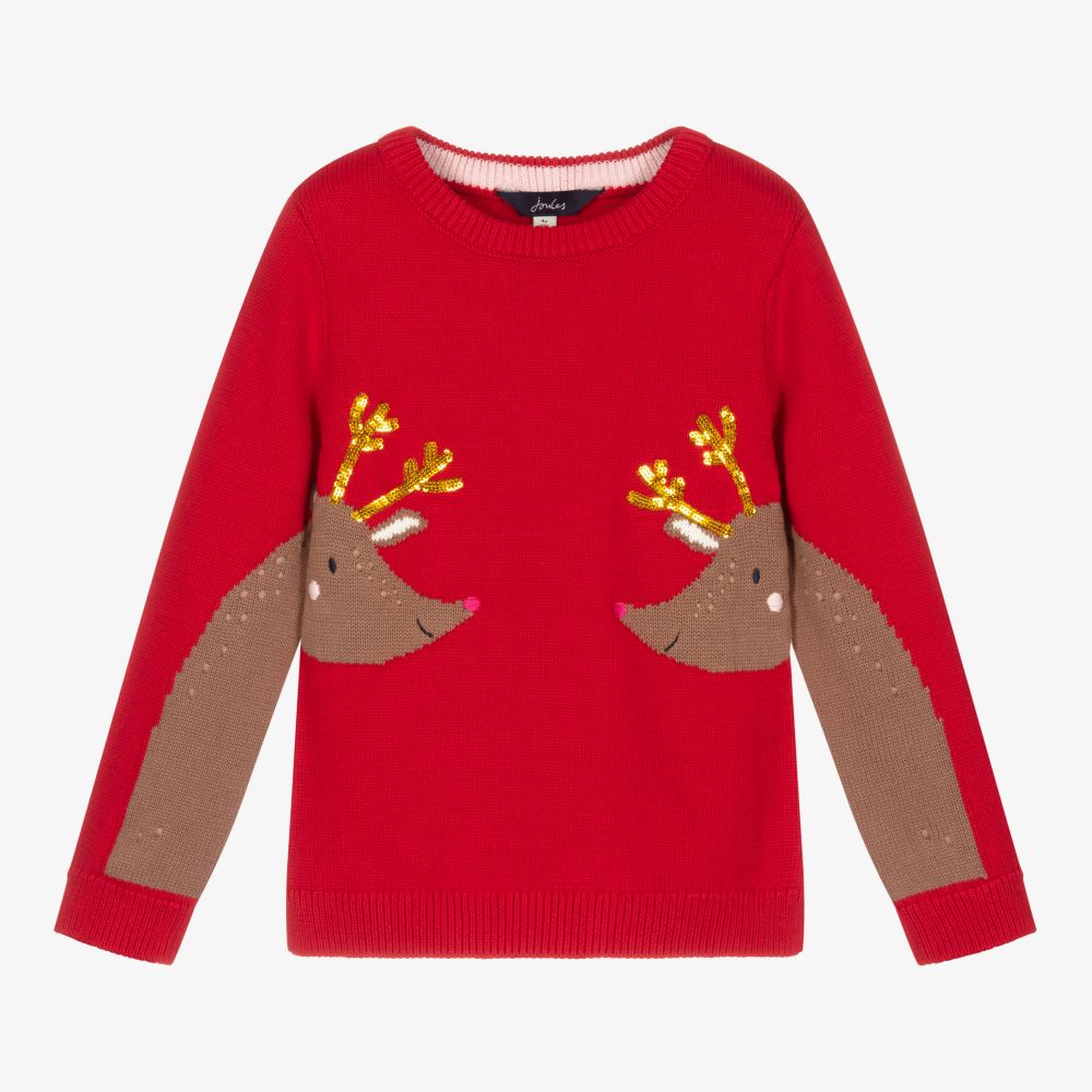 Super cute red festive sweater for boys and girls by British brand Joules, knitted in lightweight cotton. It has two brown in the weave, with shimmery gold sequinned antlers. The designer's signature hare logo is on the back, embroidered in shiny gold.