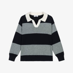 Super cute red festive sweater for boys and girls by British brand Joules, knitted in lightweight cotton. It has two brown in the weave, with shimmery gold sequinned antlers. The designer's signature hare logo is on the back, embroidered in shiny gold.