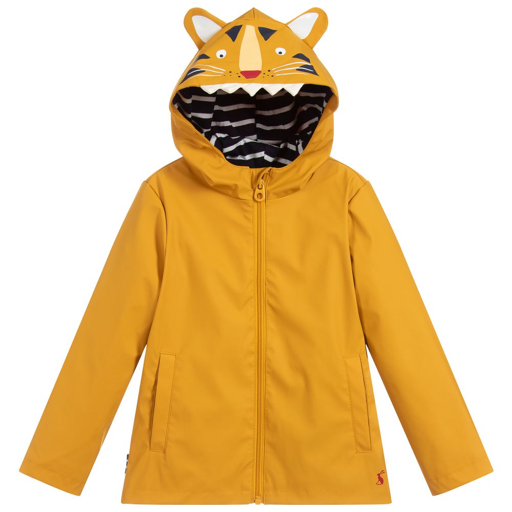 Dark yellow hooded raincoat for boys and girls by Joules. Showerproof, it is made from rubberised fabric with taped seams. There are two pockets and a cosy, navy blue fleece lining. The hood has a fun 3D tiger design and is lined with soft, striped jersey.