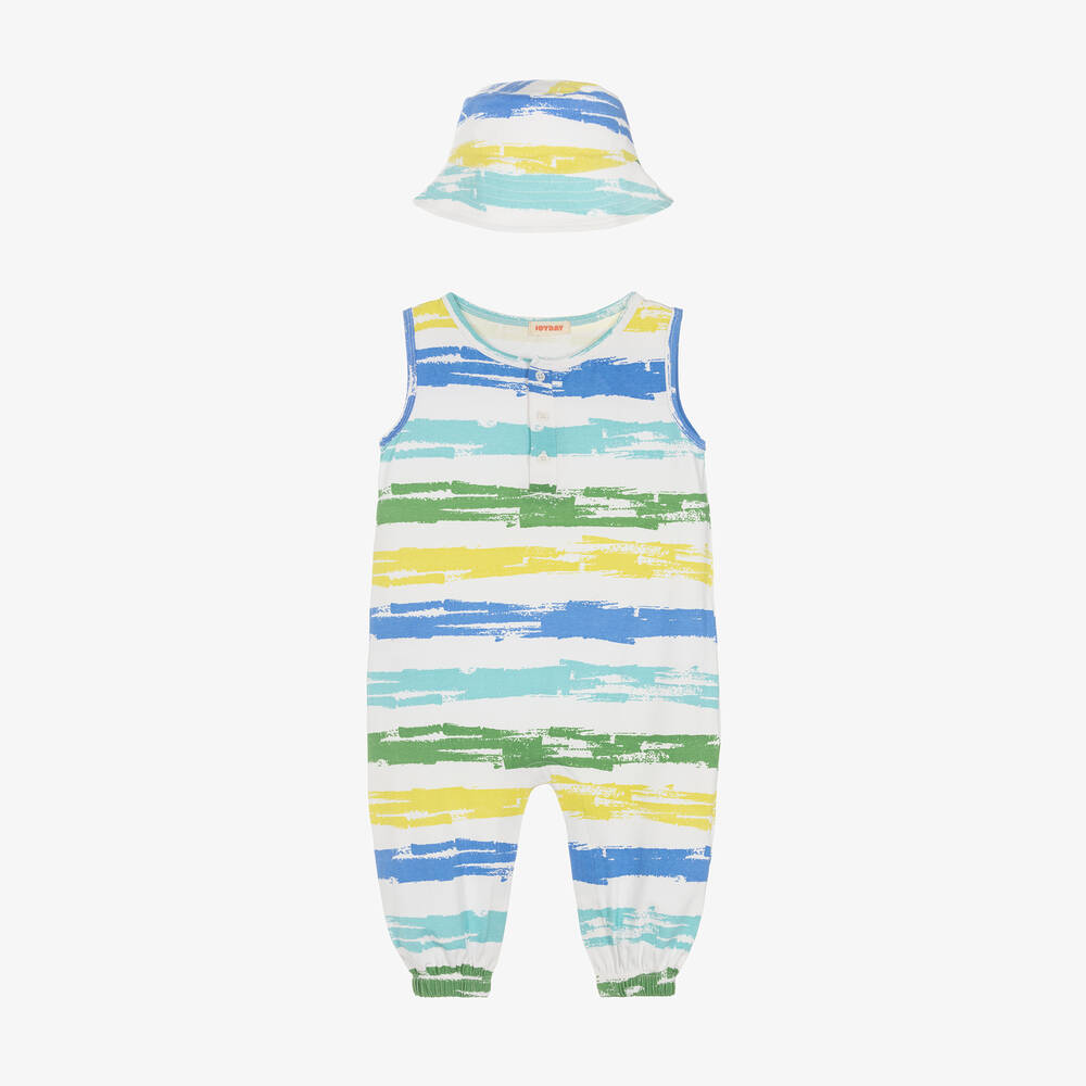 Exclusive to Childrensalon, a super cute cotton romper set for baby boys by British brand Joyday, just right for summery days. Made in soft, comfortable jersey with painted-effect stripes in shades of blue and green, the romper has button fastenings on the front placket, poppers between the legs for speedy dressing and neat, gently elasticated cuffs. A matching bucket hat completes the set, with a brim to shade little eyes from the sun and a lightweight jersey lining for comfort.