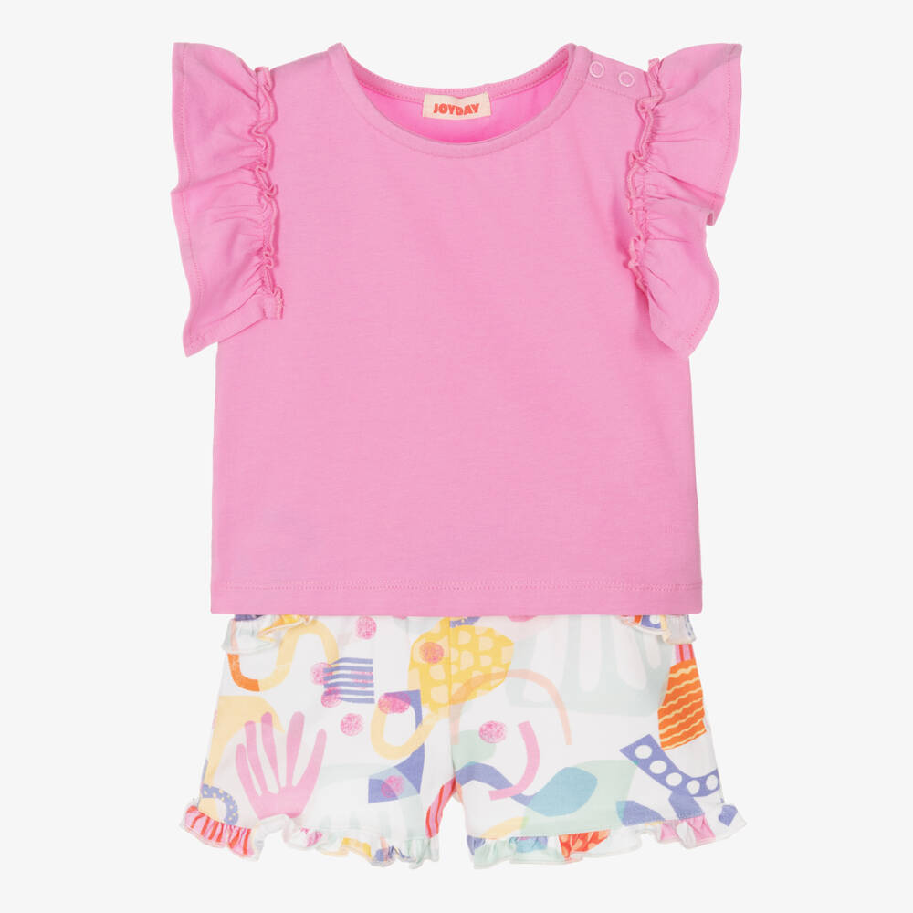 Exclusive to Childrensalon, this delightful shorts set for baby girls is by British brand Joyday. Ideal for relaxed summery days, the set is made in beautifully soft, comfortable cotton jersey. The pink T-shirt has pretty frills over the shoulders and useful popper fastenings on one shoulder for speedy dressing. The white and pink shorts have a colourful abstract pattern and feminine frills on the front pockets and cuffs. Easy to wear, the waist is gently elasticated and they simply pull up.
