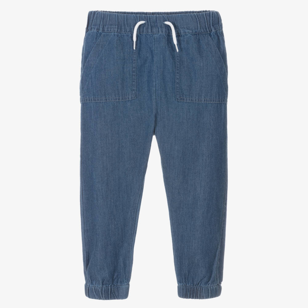 Blue chambray trousers for boys and girls by Joyday, exclusive to Childrensalon. Ideal for casual days, they are made in comfortable cotton, with a gently elasticated waistband and cuffs. There is a faux drawstring on the waist and useful patch pockets on the front.