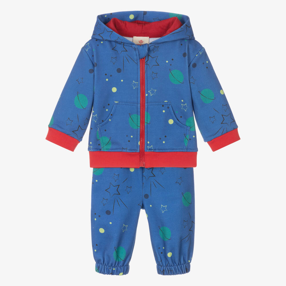 Exclusive to Childrensalon, a mid-blue tracksuit for baby boys and girls by Joyday, with a planet and stars print in green, black and yellow. Endlessly comfortable, it is made in stretchy cotton jersey with a super soft, fleecy inside for cosiness. The hooded jacket has a red ribbed trims for extra warmth, a useful chin guard on the exposed red zip fastening and handy patch pockets on the front. The joggers have a gently elasticated waist with a faux drawstring and elasticated cuffs.