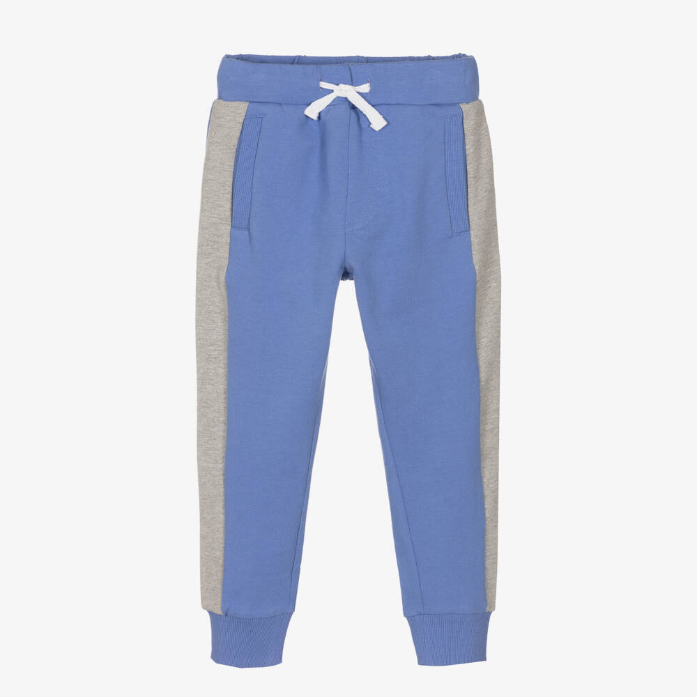 Cornflower blue cotton joggers for boys and girls by Joyday, exclusive to Childrensalon. Ideal for relaxed days, they are made in comfortable jersey with grey marl sides, useful front pockets and neat, ribbed cuffs. The elasticated waistband has a white drawstring for a great fit.