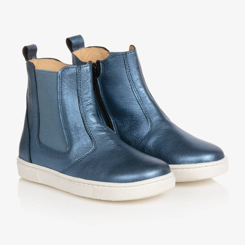 Cool blue leather boots for boys and girls by British brand Joyday, exclusive to Childrensalon. Made in soft, supple leather with a lustrous sheen, they have a blue, elasticated panel on the outer side for comfort and stretch. The lining and insole are made in super soft leather and they fasten with a zip. There is a white, non-slip, rubber sole.
