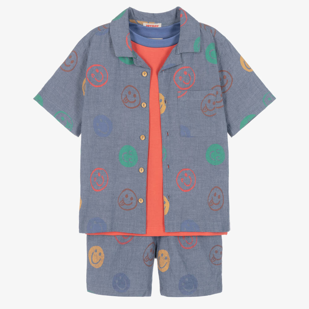 Casual blue chambray shorts set for boys by British brand Joyday, exclusive to Childrensalon and patterned with colourful, happy faces. Made in lightweight cotton, the shirt has a small, revere collar, a chest pocket and front button fastenings. The matching shorts have a stretchy, elasticated waistband with a white drawstring for a neat fit, and useful jetted front pockets. The set is completed with a red cotton jersey T-shirt that has a blue, ribbed neckline.