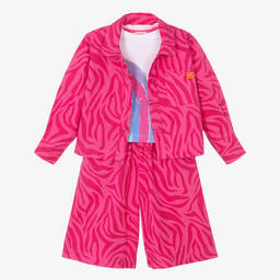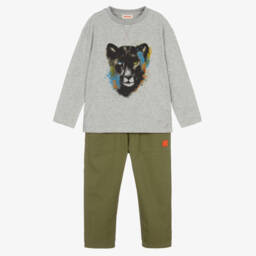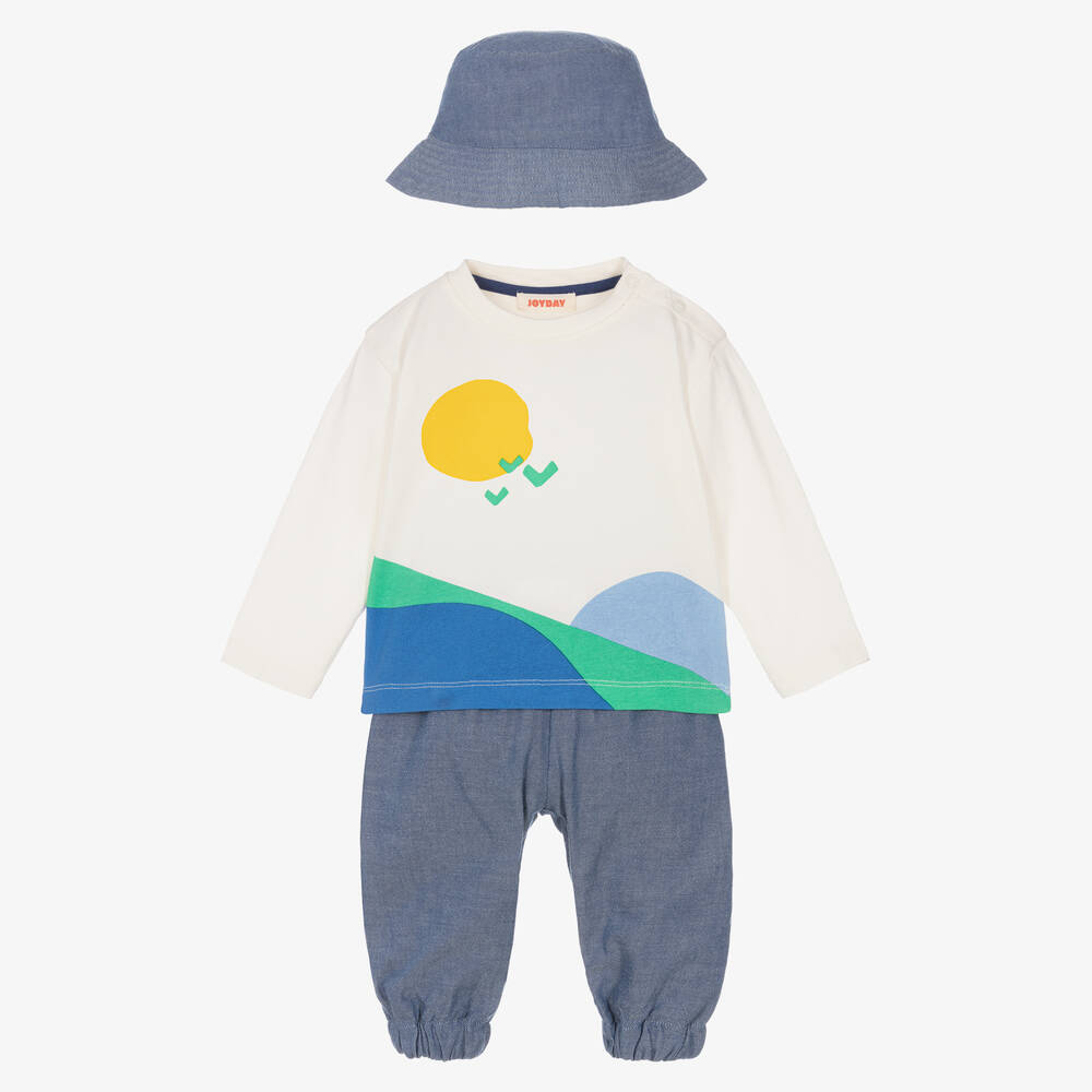 Cute ivory and blue cotton trouser set for little boys by British brand Joyday, exclusive to Childrensalon. The top is made in soft, comfortable jersey with a sunny landscape print in yellow, blue and green, and useful popper fastenings on one shoulder to help with dressing. The spacious, jogger-style trousers are made in blue chambray with a jersey lining for comfort and an adjustable drawstring waist for a good fit. Completing the set is a cute bucket hat in matching chambray with a soft jersey lining, which is gentle against delicate skin.