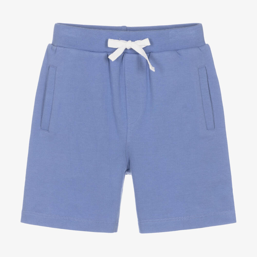 Blue cotton shorts for boys by British brand Joyday, made in comfortable sweatshirt jersey for relaxed wear. Exclusive to Childrensalon, they have an elasticated, drawstring waistband for a good fit and useful, jetted side pockets.