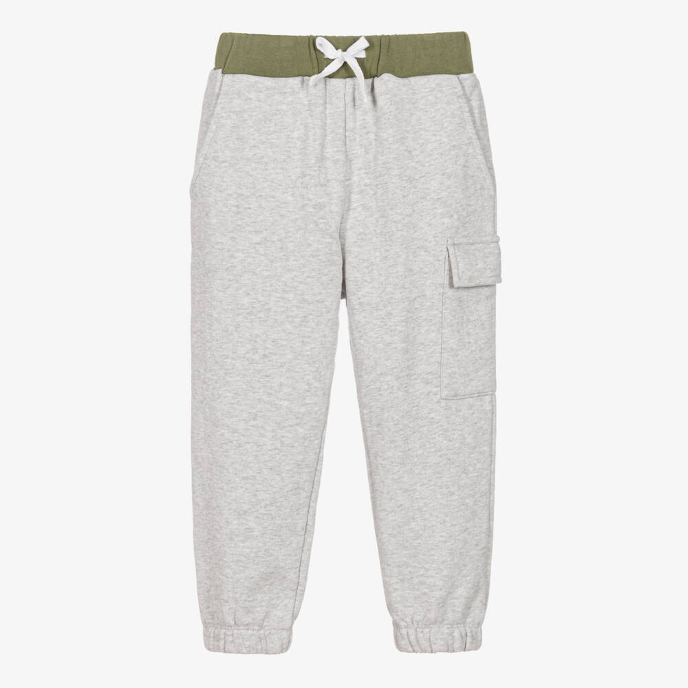Grey marl cotton joggers for boys by British brand Joyday, exclusive to Childrensalon. Just right for casual days, they have a relaxed fit and are made in stretchy jersey with a cosy, fleecy inside and gently elasticated cuffs for extra cosiness. There are slanted front pockets, a cargo-style pocket on one leg and a useful drawstring on the green, elasticated waistband for a good fit.