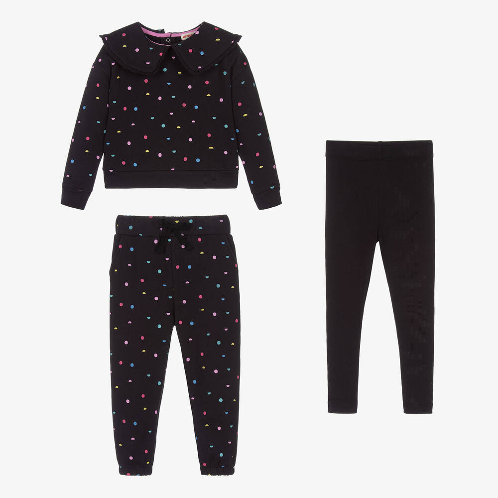 Casual with colourful polka dots, a black cotton tracksuit set for girls by British brand Joyday. Exclusive to Childrensalon, the warm, comfortable tracksuit is made in soft jersey with a cosy, fleecy inside and ribbed trims. The sweatshirt has a large collar with ruffled edging and popper fastenings on the back. The matching joggers have an adjustable drawstring waist for a good fit and useful front pockets. Completing the set is a pair of ribbed, full length black leggings with an elasticated waistband.