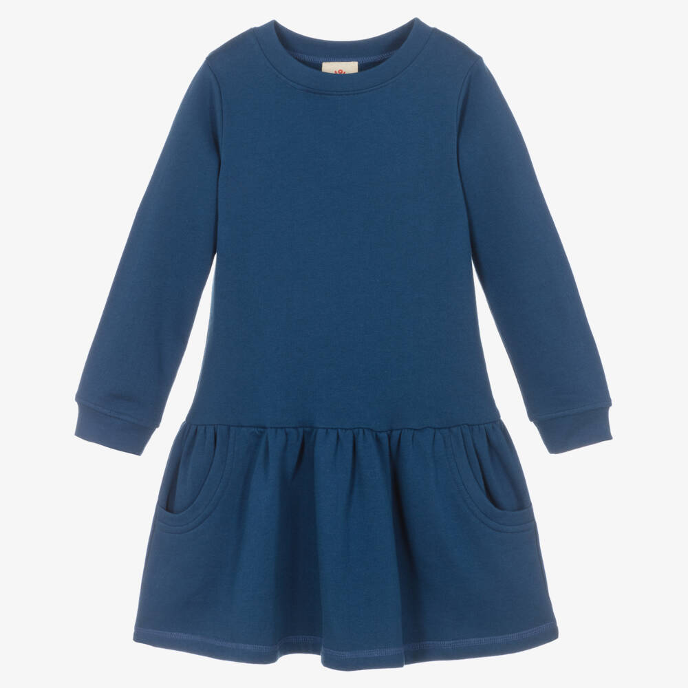 Exclusive to Childrensalon, this casual mid-blue dress for girls is by Joyday. Drop-waisted, the gathered skirt has useful side pockets. Both comfortable and easy to wear, it is made in mid-weight cotton jersey with a cosy, fleecy inside and simply pulls on.
