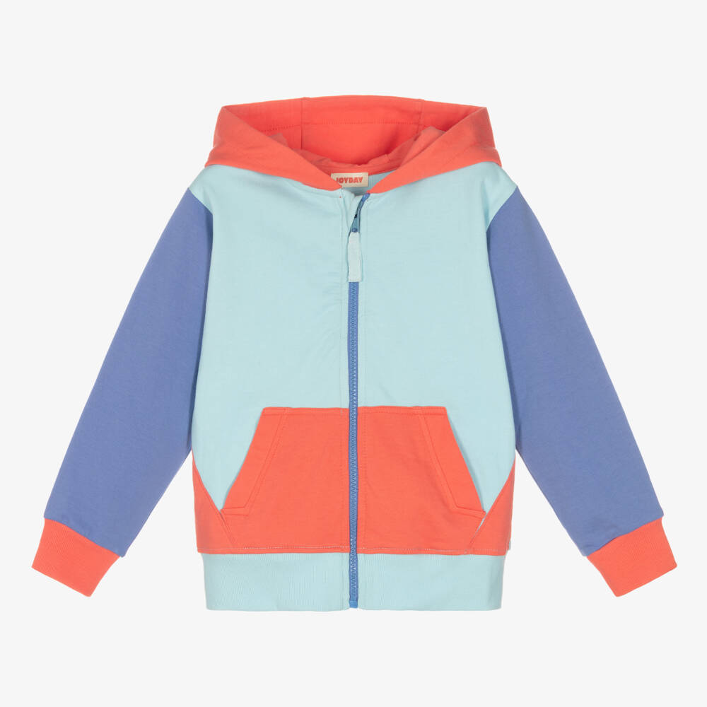 Exclusive to Childrensalon, a colourblock zip-up hoodie for girls by British brand Joyday, in shades of blue with red trims. Made in soft, comfortable, sweatshirt jersey with neat, ribbed trims and useful pouch pockets on the front, it is just right for casual days.