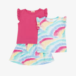 Exclusive to Childrensalon, a gorgeous pink cotton jersey skirt set for girls by British brand Joyday, with a relaxed, happy vibe. The white, short-sleeved T-shirt has a smiling sun printed on the front with a brush strokes pattern in shades of pink, blue and orange, highlighted in shimmering silver sequins. The cute, coordinating, tiered skirt has a frilled, ruched waistband, for an ultra-comfortable, casual style.