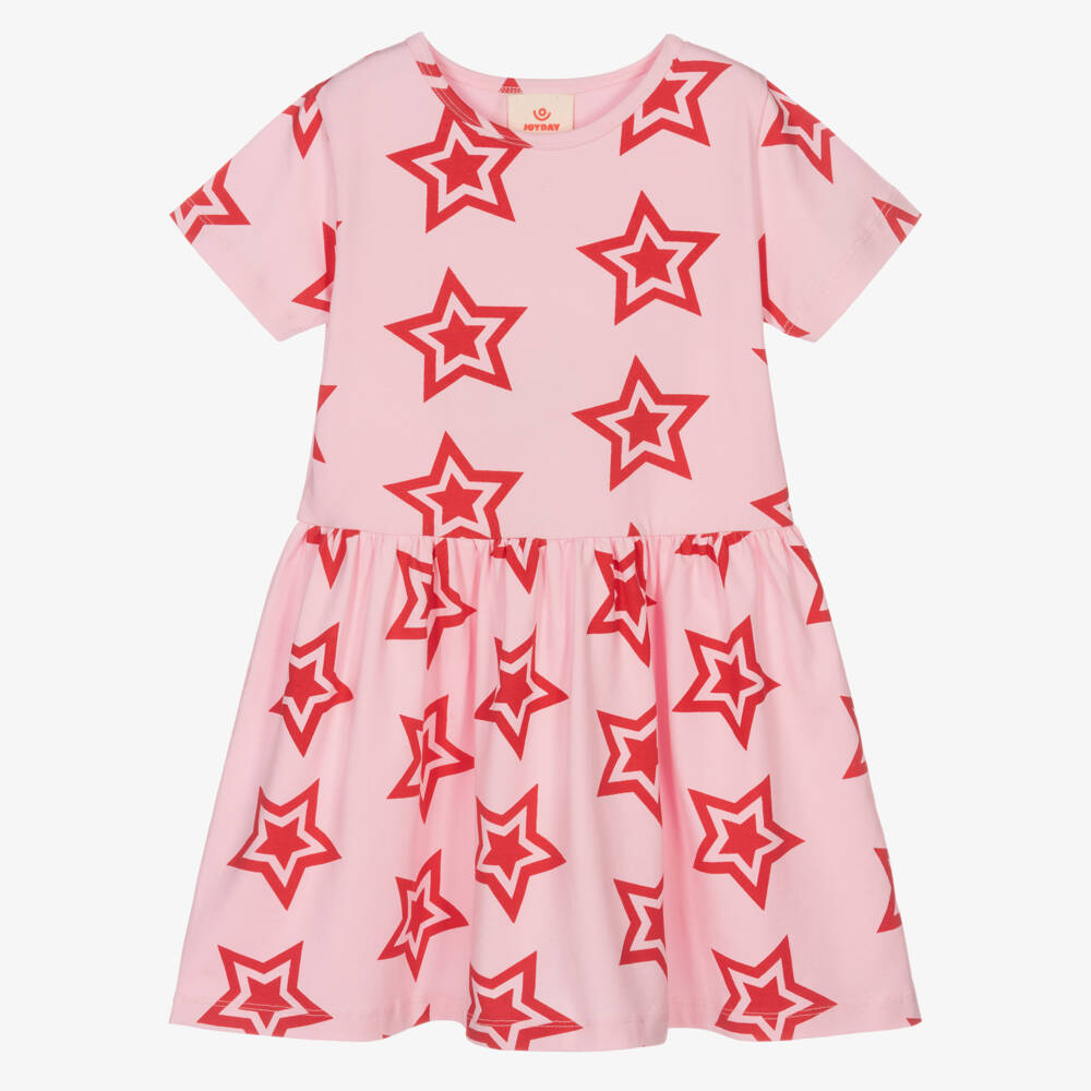 Pale pink cotton dress for girls by British brand Joyday, exclusive to Childrensalon. Soft and comfortable, it is made in stretchy jersey with a fun red star print and a full, gathered skirt.