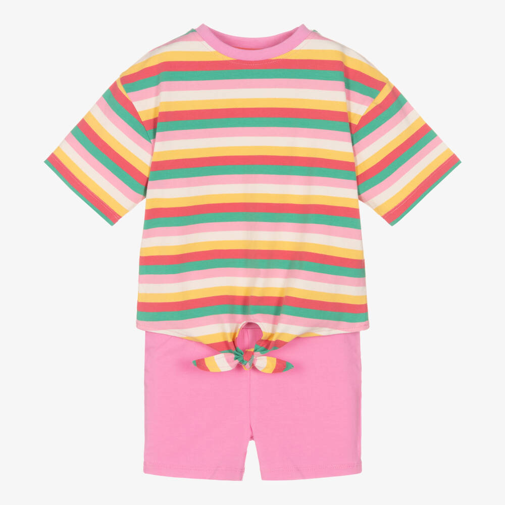 Casual, colourful and exclusive to Childrensalon, a cotton shorts set for girls by British brand Joyday. Made in soft, comfortable jersey, the T-shirt is striped in pink, green and yellow, with a cute tie on the front of the hemline. The coordinating pink shorts are easy to wear, simply pulling up.