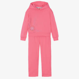 Cute purple cotton tracksuit for girls by British brand Joyday, exclusive to Childrensalon. With pretty, feminine detailing, it has a shimmering, sequinned and embroidered rainbow on the hoodie and an embroidered sun on the joggers in pink and yellow. Made in comfortable, sweatshirt jersey with cosy ribbed trims, the hoodie has a relaxed fit with dropped shoulders, whilst the joggers have an elasticated, drawstring waistband for a great fit.