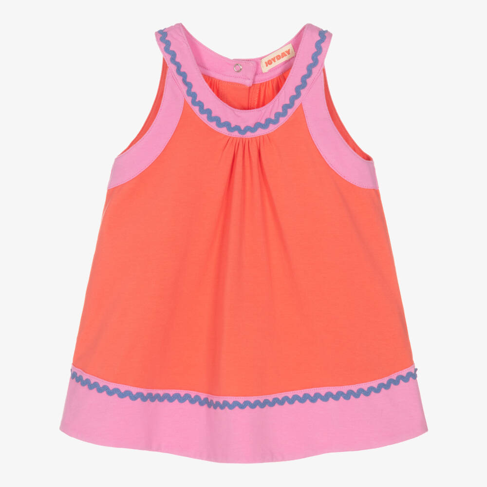 Gorgeous red cotton dress for little girls by British brand Joyday, exclusive to Childrensalon. Trimmed in pink with blue ric rac, it is gathered below the neckline and has a popper fastening on the back. Made in comfortable jersey, it is just right for relaxed, sunny days. It comes with useful red knickers.