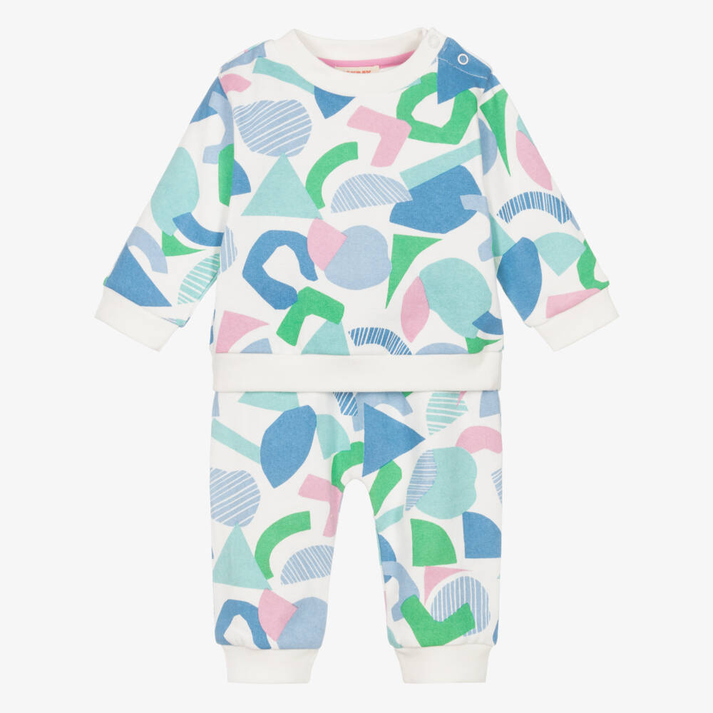 Exclusive to Childrensalon, a white cotton tracksuit for little girls by British brand Joyday, with a fun abstract print in blue, green and pink. It is made in soft, comfortable jersey with a cosy, fleecy inside and ribbed trims for extra warmth. The sweatshirt has useful popper fastenings on one shoulder for speedy dressing. The joggers have a gently elasticated waistband, just right for little tummies.