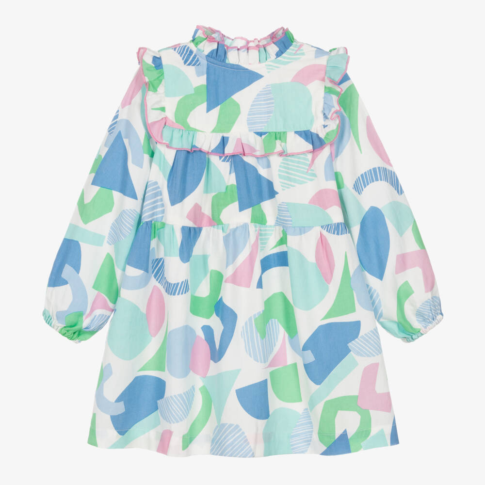 Pretty white twill dress for girls by British brand Joyday, exclusive to Childrensalon. Made in soft viscose, it has a fun, abstract print in blue, green and pink, with ruffles around the neckline and bodice. The dress has full sleeves with gently elasticated cuffs a gathered skirt and button fastenings on the back. It is lined in lightweight voile for comfort.