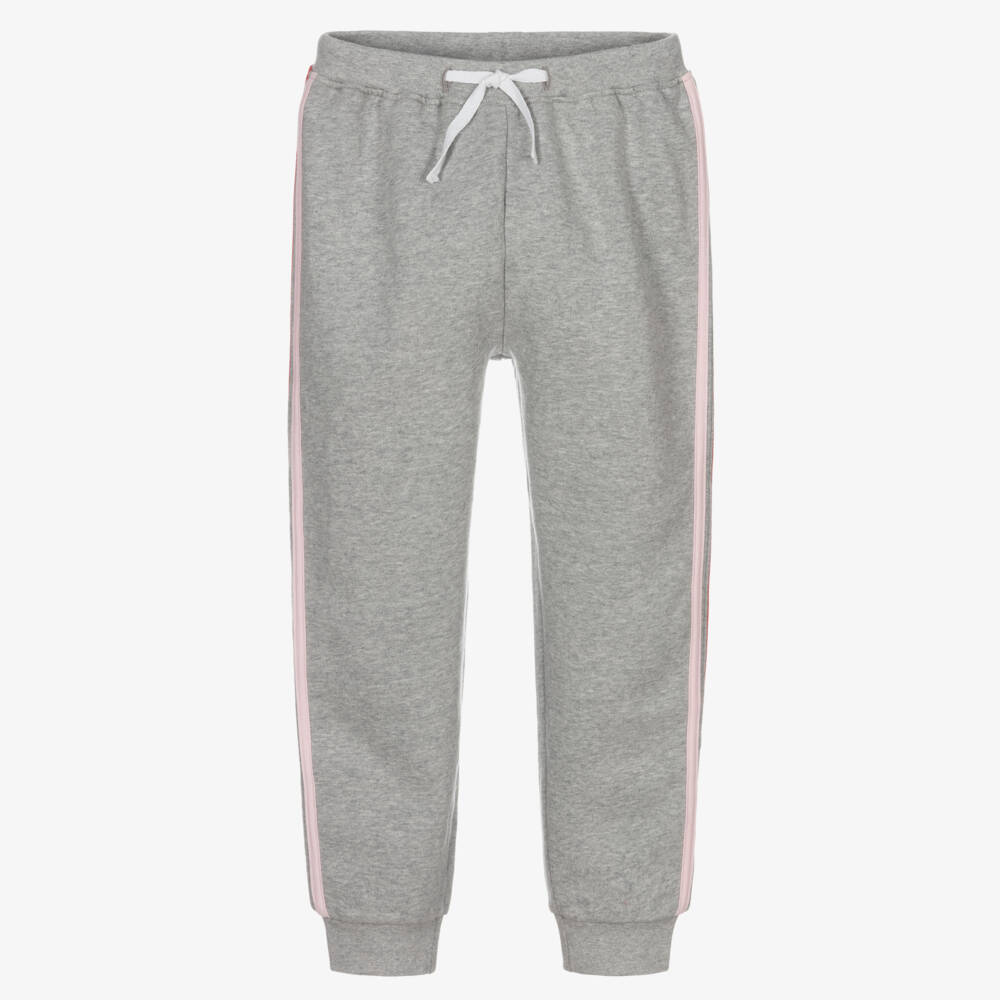 Exclusive to Childrensalon, a pair of grey marl joggers for boys and girls by Joyday. With relaxed, sporty styling, they have red and pink striped grosgrain taping on the sides of the legs. Made in comfortable cotton jersey with a warm, fleecy inside, there is a useful drawstring waistband for a good fit.
