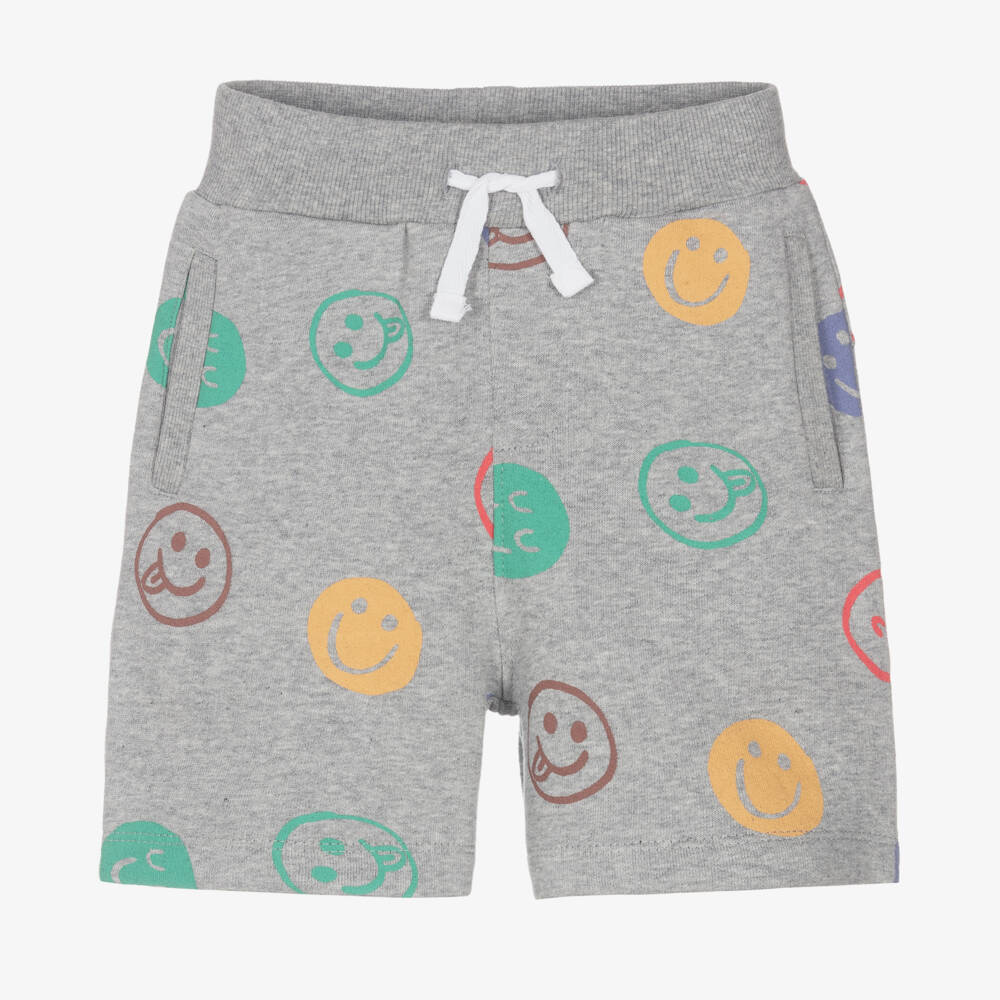 Fun grey marl cotton shorts for boys and girls by Joyday, exclusive to Childrensalon. Casual and relaxed, they are made in soft, comfortable jersey with a colourful print of happy faces. The ribbed waistband has a white drawstring for a neat fit, and there are useful pockets on the front.