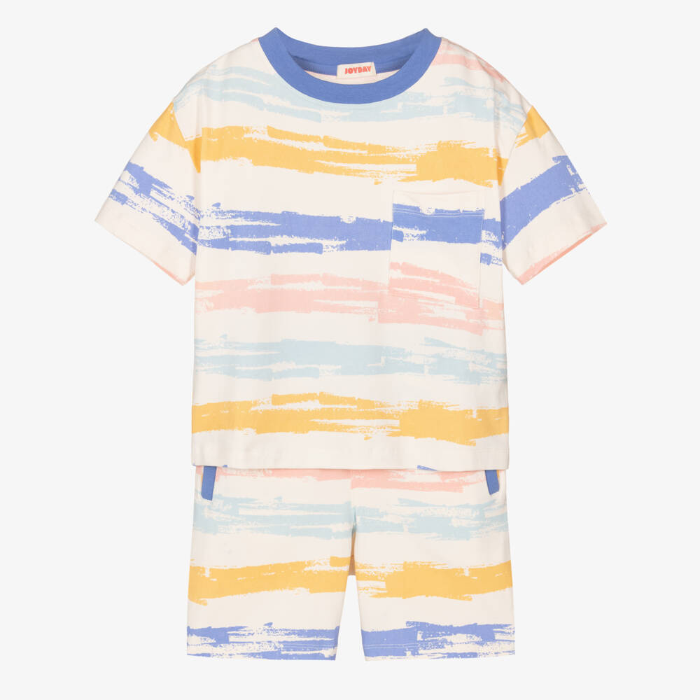 Casual ivory cotton shorts set for boys and girls by British brand Joyday, exclusive to Childrensalon, made in soft, comfortable jersey. It has a paint-effect stripe pattern in cornflower blue, yellow and pink, with blue trims. The T-shirt has a patch pocket on the chest, whilst the shorts have a drawstring waistband for a good fit and useful, jetted front pockets.